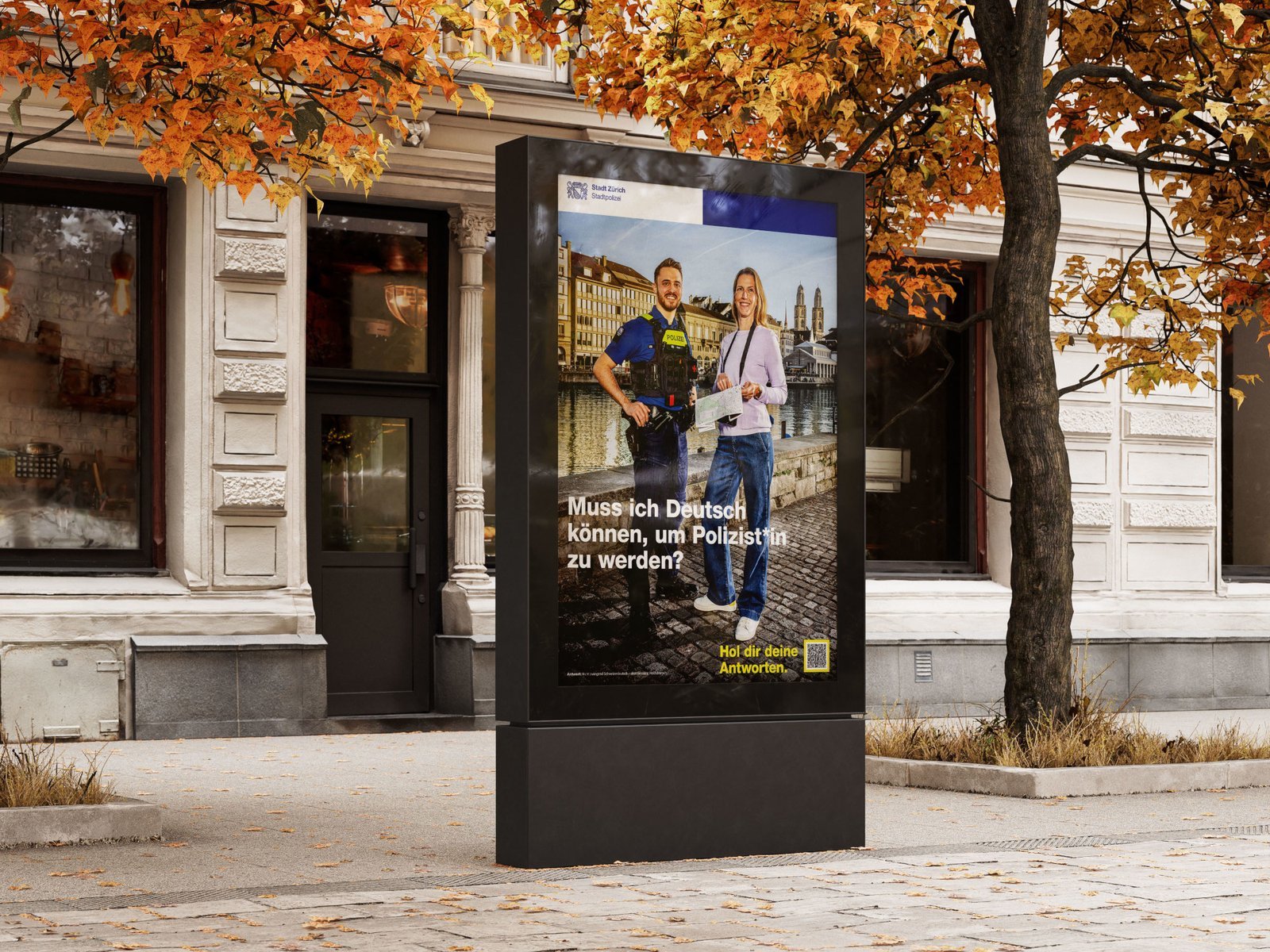 Die Arbeitgeberkampagne wird über digitale Kanäle, Social Media sowie Aussenwerbung ausgespielt. Eine Microsite (www.stadtpolizei.ch/jobs) bündelt Antworten, Informationen und eindeutige Call-to-Actions und erleichtert so den Einstieg in den Bewerbungsprozess. Ergänzend zur externen Kommunikation wurde auch intern eine angepasste Kampagne lanciert, um die Mitarbeitenden aktiv einzubeziehen und die Haltung der Stadtpolizei Zürich nach innen und aussen konsistent zu vermitteln.